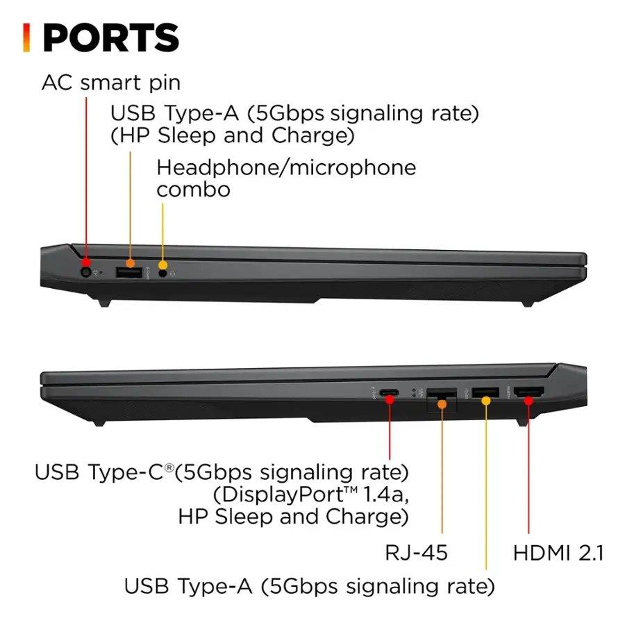 1 USB Type-C (5Gbps signaling rate, DisplayPort 1.4a, HP Sleep and Charge), 1 USB Type-A (5Gbps signaling rate, HP Sleep and Charge), 1 USB Type-A (5Gbps signaling rate), 1 RJ-45, 1 Headphone/microphone combo, 1 AC smart pin, 1 HDMI 2.1